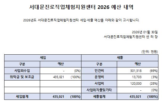 서대문진로직업체험지원센터 2026년도 세입·세출 예산 고시