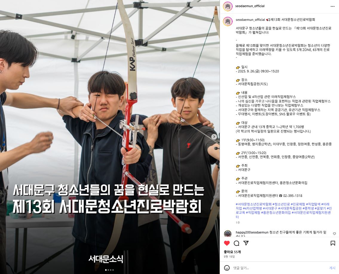 [서대문구청 SNS] 제13회 서대문청소년진로박람회 개최 안내 2025-10-02 바람 조회수 43 https://www.instagram.com/p/DOxCVeQiAMP/?utm_source=ig_web_copy_link&i… + 24