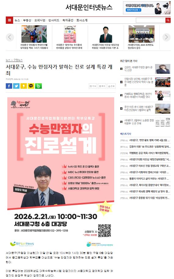 [보도자료] 서대문구, 수능 만점자가 말하는 진로 설계 특강 개최 2026-04-08 바람 조회수 20 http://sdminews.co.kr/index.do?menu_id=00000265&menu_link=/front/news/… + 12