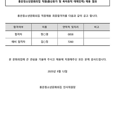 [합격자 공고]홍은청소년문화의집 직원(출산휴가 및 육아휴직 대체인력) 채용 결과