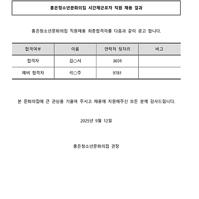 [합격자 공고]홍은청소년문화의집 시간제근로자 직원 채용 결과
